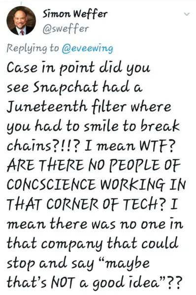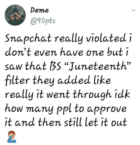 Snapchat had to have so many meetings to launch their #Juneteenth filter. And at no point did anyone with decision making power stand up and say, "THIS IS AN ABSOLUTELY HORRIBLE IDEA."