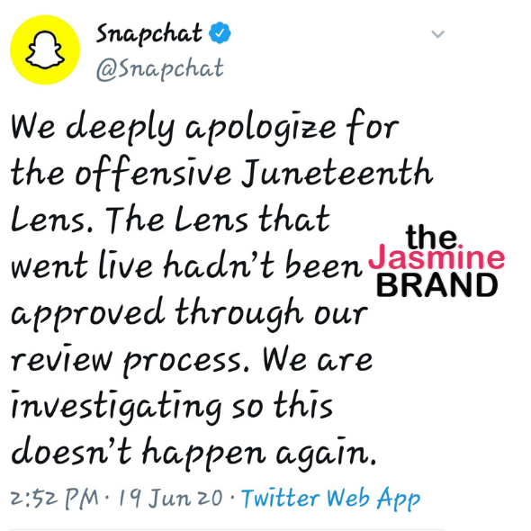 Popular social media app Snapchat has apologized for what many deemed an offensive filter intended to celebrate Juneteenth. June 19, also known as Juneteenth, Freedom Day, or Black Independence Day, is the day that enslaved African-Americans were made aware of their freedom in America as a result of the Emancipation Proclamation that was originally written in 1863.
