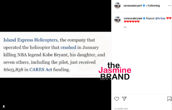 Vanessa Bryant reacted to the company receiving federal aid through a post on her Instagram page. She kept the caption simple with several broken heart Emojis. She also disabled comments on the post.