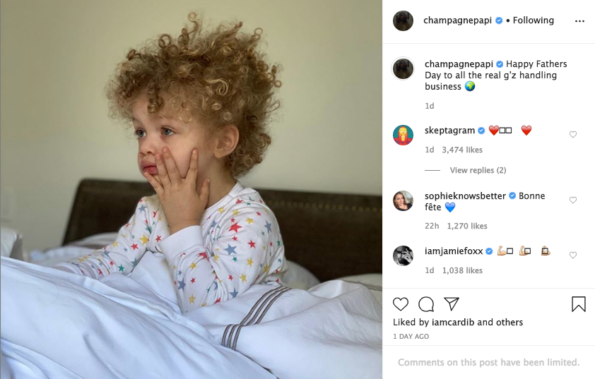 Drake shared an adorable photo his two year old, Adonis in honor of Father’s Day. In the image, Adonis sits in bed, wearing pajamas. The 33-year-old rapper captioned the post: