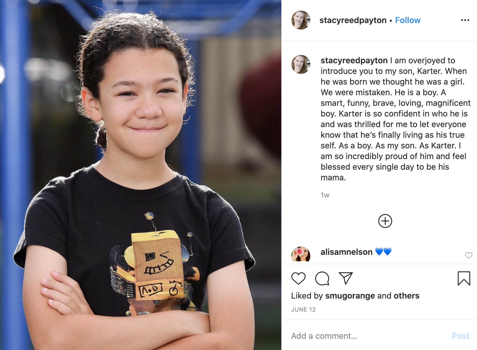 “I am overjoyed to introduce you to my son, Karter. When he was born we thought he was a girl. We were mistaken. He is a boy. A smart, funny, brave, loving, magnificent boy. Karter is so confident in who he is and was thrilled for me to let everyone know that he’s finally living as his true self. As a boy. As my son. As Karter. I am so incredibly proud of him and feel blessed every single day to be his mama.”