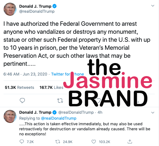 “I have authorized the Federal Government to arrest anyone who vandalizes or destroys any monument, statue or other such Federal property in the U.S. with up to 10 years in prison, per the Veteran’s Memorial Preservation Act, or such other laws that may be pertinent…..”