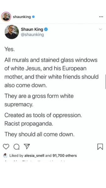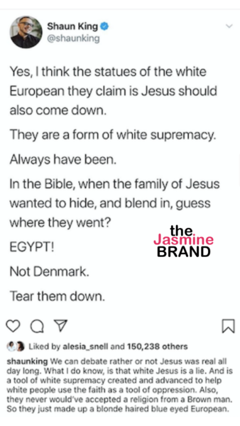 His tweet also comes as activist Shaun King calls for the removal of white Jesus statues and paintings.