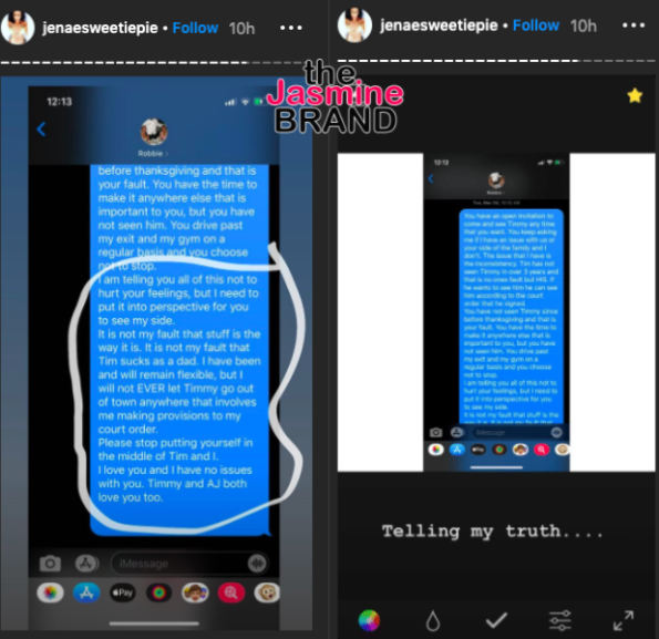 Jenae posted a slew of claims alleging that her ex-boyfriend, Tim has been abusive in the past and that he hasn’t spent time with his son over the past four years. She also claims that she and Ms. Robbie had a good relationship until recently, citing Tim as the issue. (see messages below)