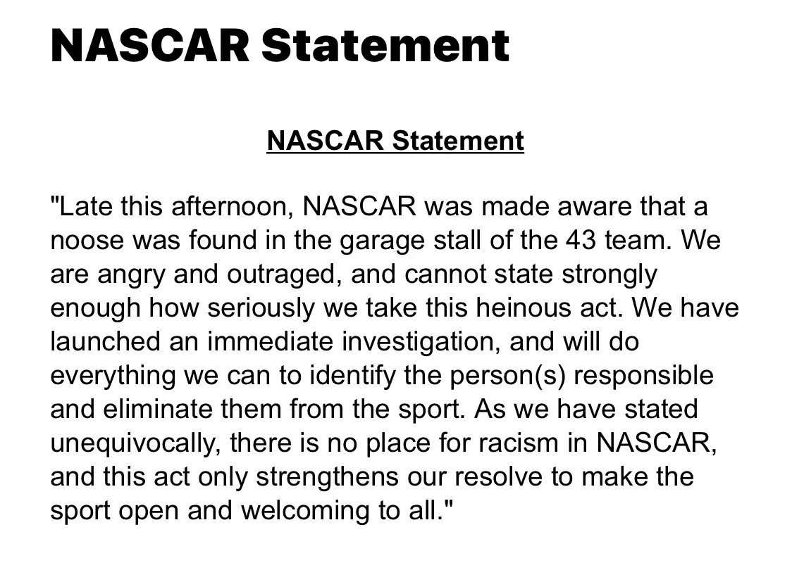 “Late this afternoon, NASCAR was made aware that a noose was found in the garage stall of the 43 team. We are angry and outraged, and cannot state strongly enough how seriously we take this heinous act. We have launched an immediate investigation, and will do everything we can to identify the person(s) responsible and eliminate them from the sport. “As we have stated unequivocally, there is no place for racism in NASCAR, and this act only strengthens our resolve to make the sport open and welcoming to all.”
