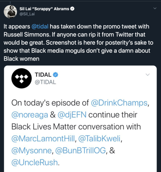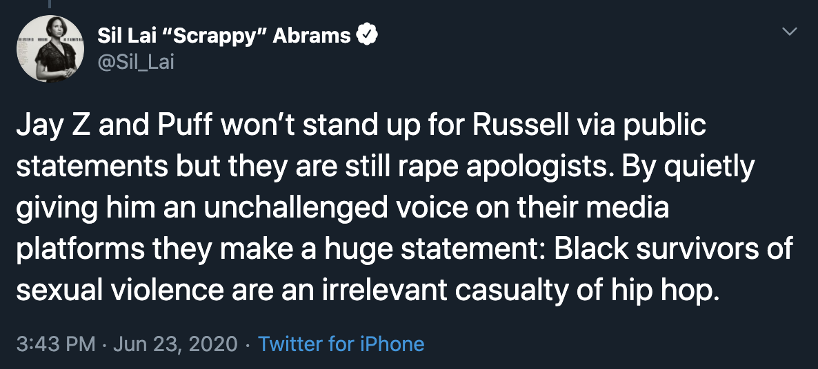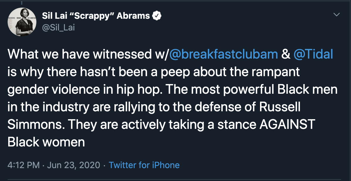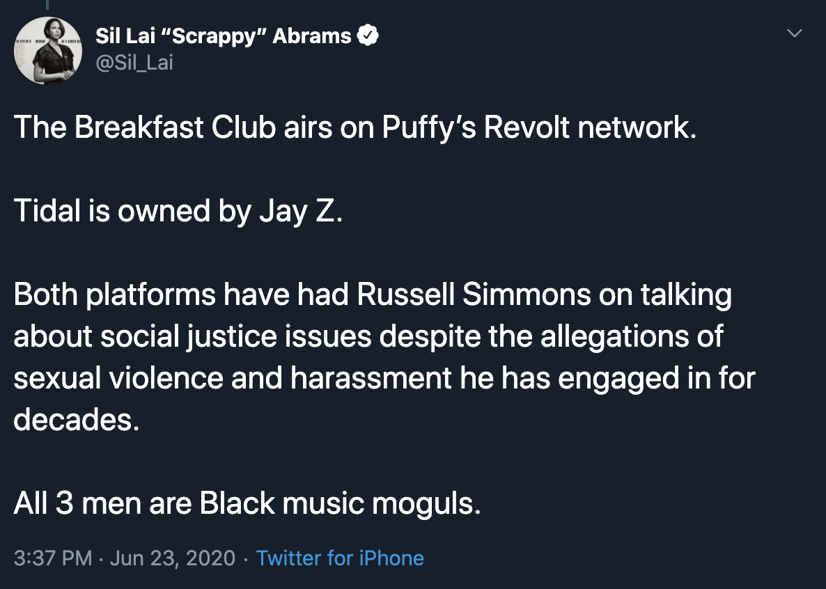 “This redemption campaign of Russell Simmons enabled by other media moguls like Jay Z, 50 Cent, and Puffy must be called out. Anyone who aids Russell in his quest to avoid being held accountable for his actions against Black women is complicit & should ALSO be held accountable.What we have witnessed w/@breakfastclubam & @Tidal is why there hasn’t been a peep about the rampant gender violence in hip hop. The most powerful Black men in the industry are rallying to the defense of Russell Simmons. They are actively taking a stance AGAINST Black women.”