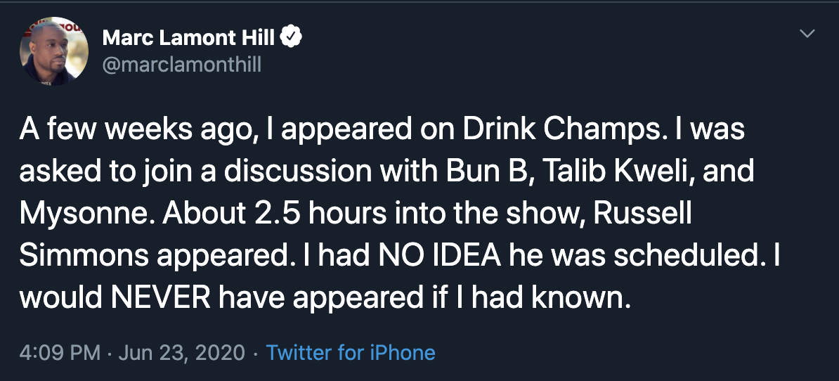 “A few weeks ago, I appeared on Drink Champs. I was asked to join a discussion with Bun B, Talib Kweli, and Mysonne. About 2.5 hours into the show, Russell Simmons appeared. I had NO IDEA he was scheduled. I would NEVER have appeared if I had known. During Russell’s 20ish minutes on the show, I was texting the producers telling them that I was not comfortable with his press and asking to wrap. After the show, I expressed my frustration with what happened. I also asked them not to air Russell’s portions.When the show was aired, Russell was not on it. I assumed that my request was honored. Today, I see a Part 2 was posted with his commentary included. I am beyond disappointed that this is the case. I stand with, and fully believe, the women who have come forward about Russell’s sexual violence. I am sorry that I shared space with someone who has caused such harm without accountability. Although I had NO IDEA he’d be on, I am nonetheless deeply sorry that I was a part of it.”