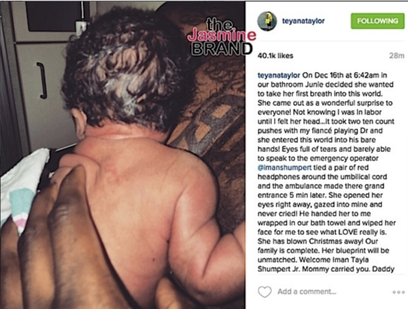 This will not be the first home birth for either Taylor nor Iman Shumpert. The couple’s first child, Junie Shumpert, was delivered at home (12/17/15), in their bathroom, by Iman himself.