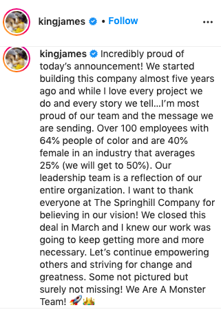 Maverick Carter will serve as the CEO of SpringHill, and it will combine LeBron James’ SpringHill Entertainment along with two other firms, Uninterrupted, (an athlete empowerment media and consumer products firm), and The Robot Company, which is (a brand and culture agency.) James will serve as chairman of the board.