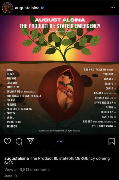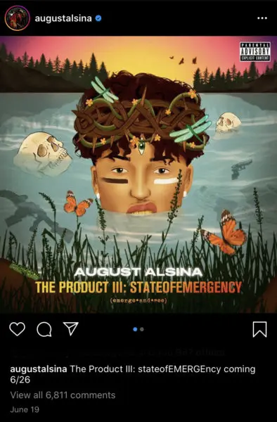 The 27-year-old revealed his long-awaited return to the music scene on June 18th on Instagram when he posted the cover art for his 27-track album that dropped today (June 26th). The Product III: State of Emergency cover shows August Alsina as an animated character with his face halfway submerged in a body of water, wearing a thorn crown on top of his head while surrounded by two human skulls, an automatic rifle, a handgun, and a police car.
