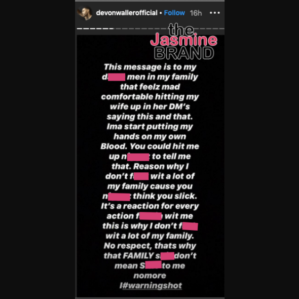 Former Love & Hip Hop: Hollywood star Hazel E’s fiancé is not having it with some of his family members and has fired a warning shot on social media. New father De’Von Waller has taken to Instagram to publicly defend his family and speak his mind on who he considers “disrespectful” family members. In one of the two posts to his Instagram stories, De’Von Waller completely calls out his male family members and even threatens physical retaliation if Hazel E continues to be contacted by them within her DMs. He wrote,