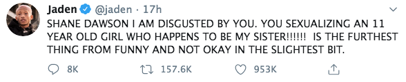 SHANE DAWSON I AM DISGUSTED BY YOU. YOU SEXUALIZING AN 11 YEAR OLD GIRL WHO HAPPENS TO BE MY SISTER!!!!!! IS THE FURTHEST THING FROM FUNNY AND NOT OKAY IN THE SLIGHTEST BIT.