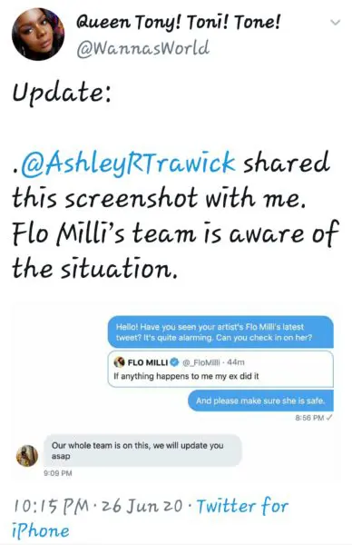Some of her fans went the extra mile and sent her team screenshots of the tweet and asked for them to check on Flo Milli.