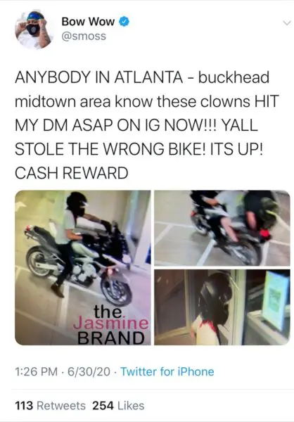Bow Wow is prepared to dish out some serious cash as a reward for anyone with information on two men who allegedly stole the rapper’s motorcycle. He announced on social media that his silver-black motorcycle was stolen and he has photos from the security camera to prove it.