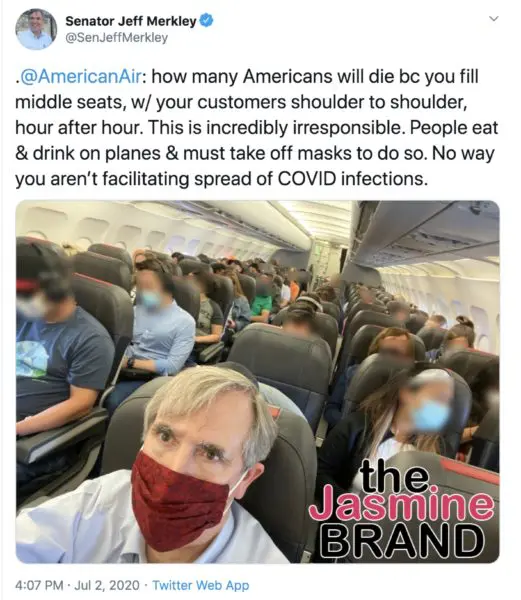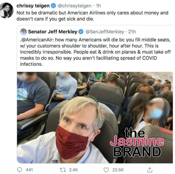 American Airlines has been receiving some backlash after the company announced that they will be resuming full-capacity flights, amid the recent surge in positive COVID-19 cases. Chrissy Teigen, 34, was the latest celebrity to voice her opinion on the airline’s decision. The TV-personality star retweeted a post by Senator Jeff Merkley, who called out the airlines for failing to social distancing one of their flights. He tweeted: