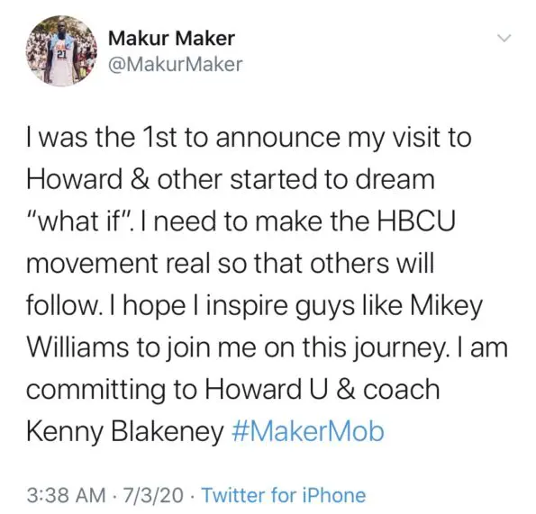 “I was the 1st to announce my visit to Howard & other started to dream “what if”. I need to make the HBCU movement real so that others will follow. I hope I inspire guys like Mikey Williams to join me on this journey. I am committing to Howard U & coach Kenny Blakeney #MakerMob”