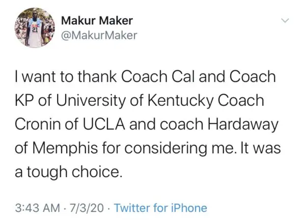 “I want to thank Coach Cal and Coach KP of University of Kentucky Coach Cronin of UCLA and coach Hardaway of Memphis for considering me. It was a tough choice.”