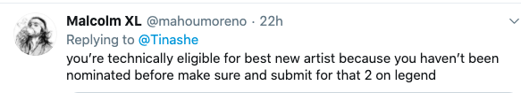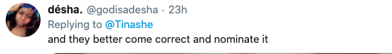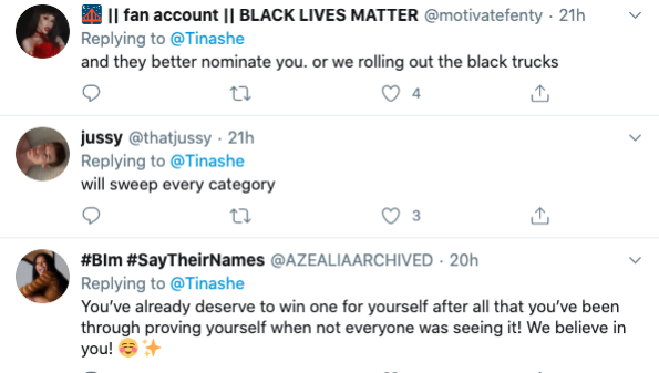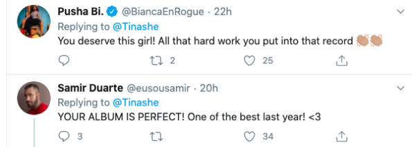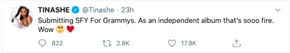 Tinashe released Songs For You in November 2019, making it her fourth studio album released through her own record label, Tinashe Music Inc. Many of her fans backed her submission on Twitter.