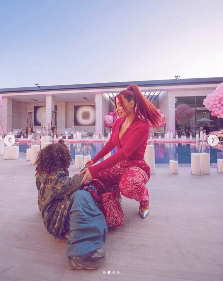 Kim Kardashian Rocks Red Hair & Matching Ensemble, While Posing with Son Saint West [Photos]