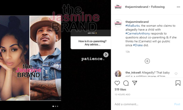 This isn’t Mia’s first time letting the world know her feelings about Carmelo. During his stint as a player for the Chicago Bulls, Carmelo and Mia reportedly had an affair – one which Mia says resulted in a baby girl.