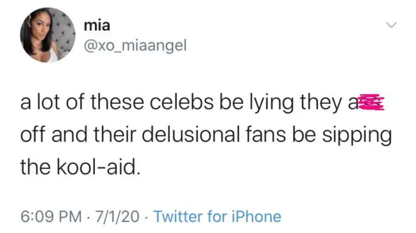 “a lot of these celebs be lying they a** off and their delusional fans be sipping the kool-aid…you can speak the truth until you’re blue in the face and people will still try to change it to a narrative that is suitable for them…basically i guess we just have to let people cap in peace.”