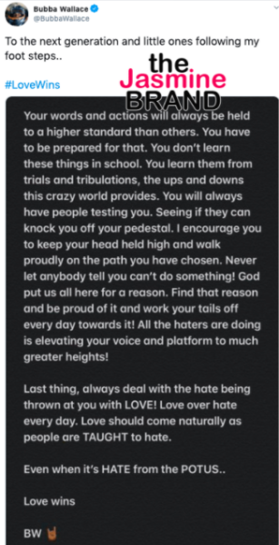 “Last thing, always deal with the hate being thrown at you with LOVE! Love over hate every day. Love should come naturally as people are TAUGHT to hate. Even when it’s HATE from the POTUS.. Love wins…”