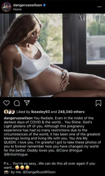 As Ciara(34) waits for baby number three to arrive, her husband, NFL star Russell Wilson, gushed over her “godly shine” in an Instagram post on Friday, July 3rd. In the caption Russell Wilson writes: