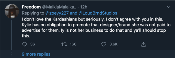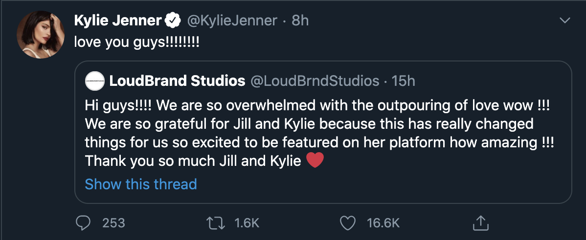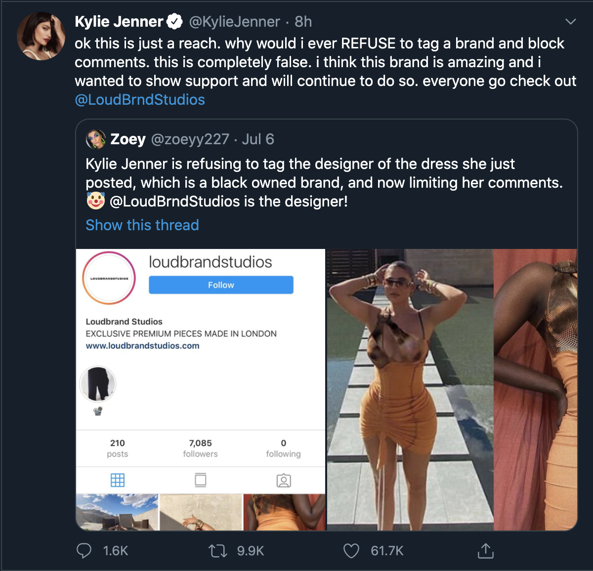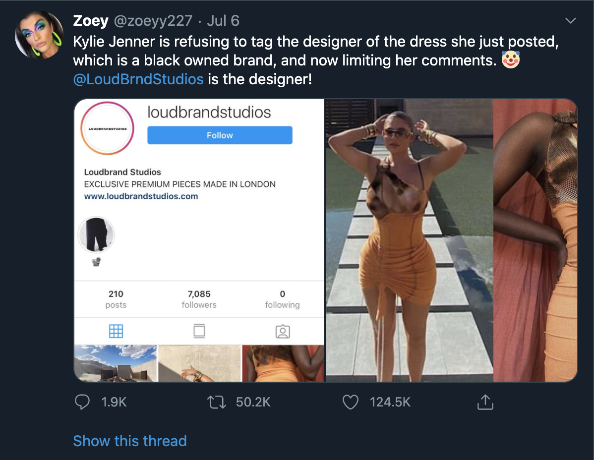 The company, Loud Brand Studios, is black owned. The controversy began a discussion on social media about influencers like Kylie Jenner wearing clothing from black owned brands, but not acknowledging them by tagging them. The criticism initially started with this tweet from one social media user.