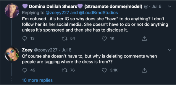 “ok this is just a reach. why would i ever REFUSE to tag a brand and block comments. this is completely false. i think this brand is amazing and i wanted to show support and will continue to do so. everyone go check out @LoudBrndStudios”