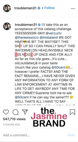 As far as this clip goes…it’s cute… old,outdated,& in poor taste (much like your catalog @50cent)… however I prefer FACTS… AND THE FACT REMAINS….I HAVE NEVER GIVEN ANY INFORMATION TO ANY FORM OF LAW ENFORCEMENT AT ANYTIME IN LIFE TO GET ANYBODY ANY TIME FOR ANY CRIME?? Supreme told me to ask @50cent if he can say the same… WELL THATS ALL I HAVE TO SAY ABOUT THAT SO…. let’s set this date & select ya songs off that 1hot album you got & let’s lay your lil overrated, outdated, steroid inflated ass catalog to rest. RIP to @50cent catalog … I seen you bully all them NY niggaz for years…NOT DA KING THO NIGGA… “You Got Da Right 1” #BringMeDaBully