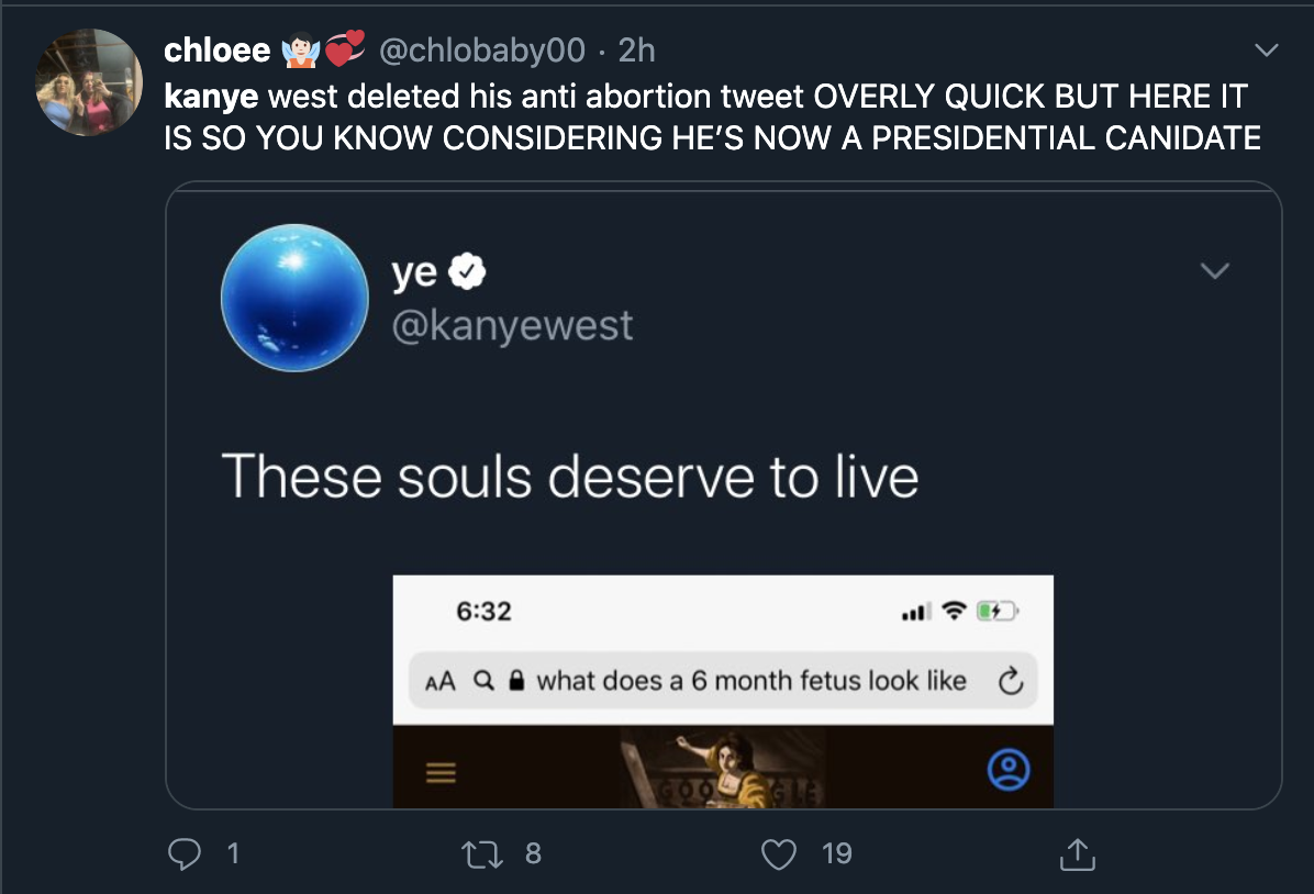 The Pro-life tweet comes after a recent interview the rapper did with Forbes, detailing his presidential campaign and his stances on the different topics that have been discussed in the race. Kanye West shared his his pro-life stance in a few words,