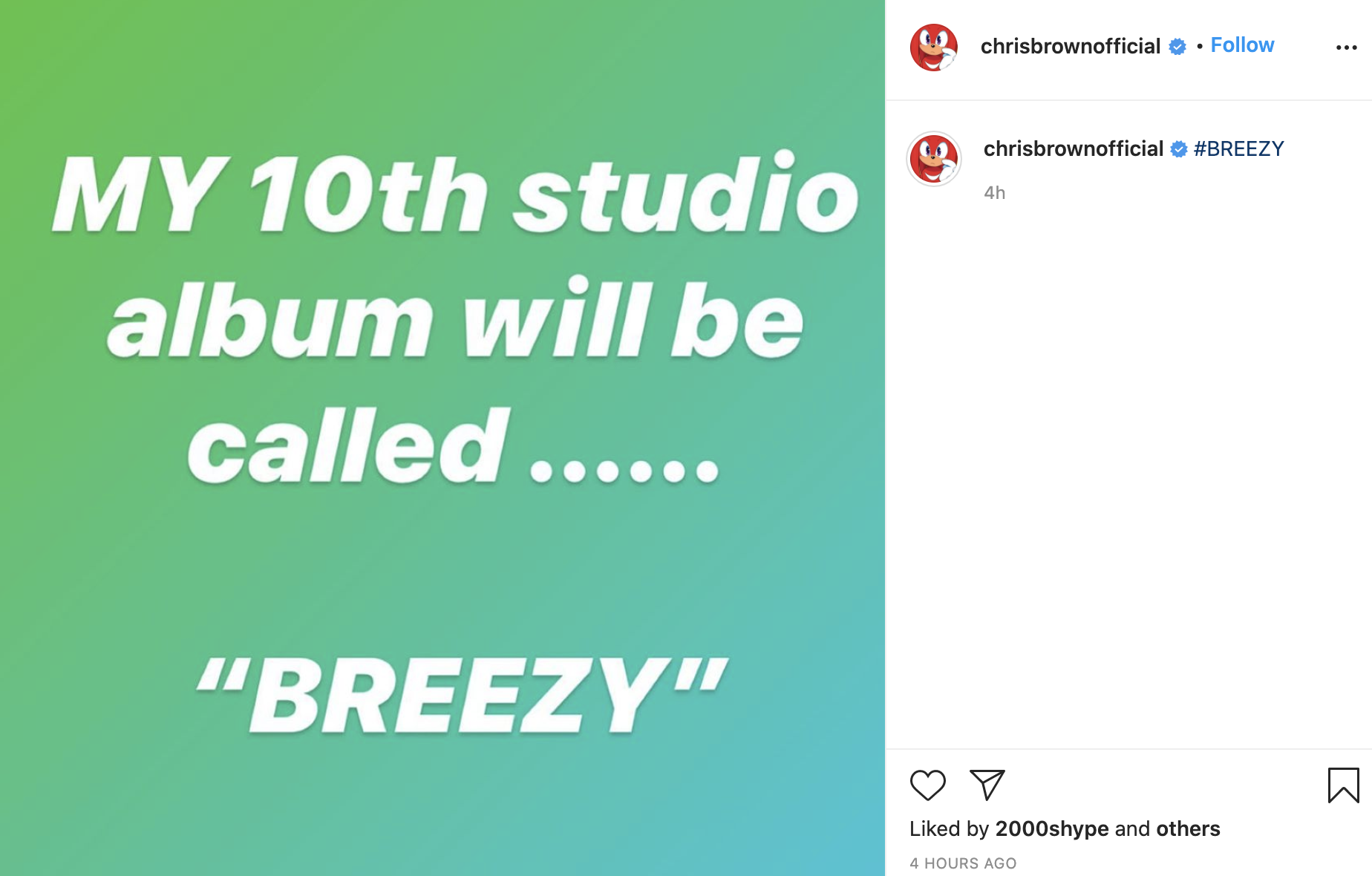 Singer Chris Brown took to his Instagram to announce exciting music news to his fans. The R&B crooner announced that his 10th studio album will be titled Breezy, inspired by his longtime nickname. He made the announcement Thursday (July 9) and simply captioned the post,