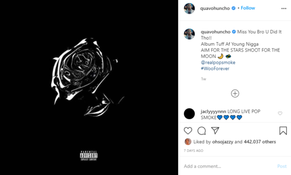 “Miss You Bro U Did It Tho!! Album Tuff Af Young N*gga AIM FOR THE STARS SHOOT FOR THE MOON @realpopsmoke #WooForever”