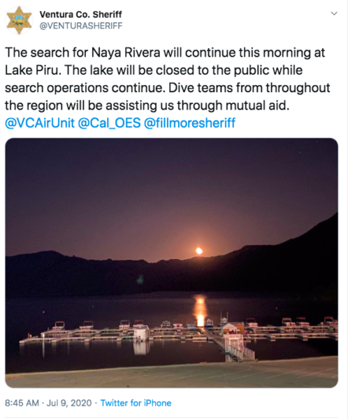 The missing person at Lake Puru has been identified as Naya Rivera, 33, of Los Angeles. SAR operation will continue at first light. @VCAirUnit @fillmoresheriff @Cal_OES pic.twitter.com/bC3qaZS3Ra
