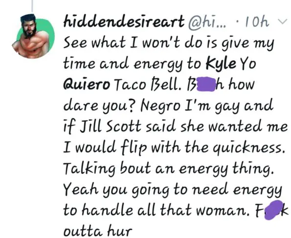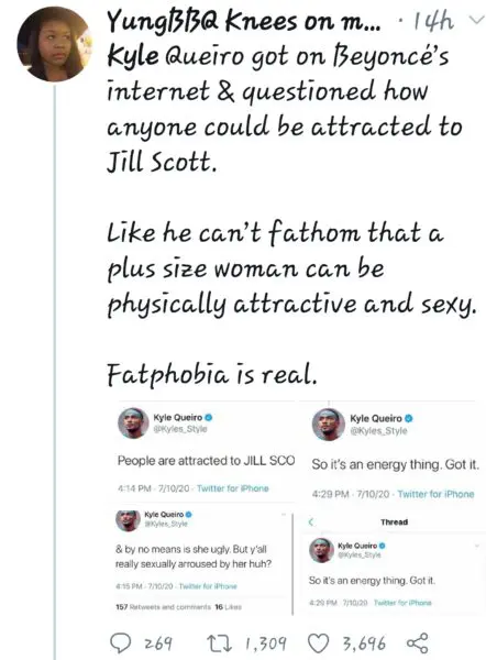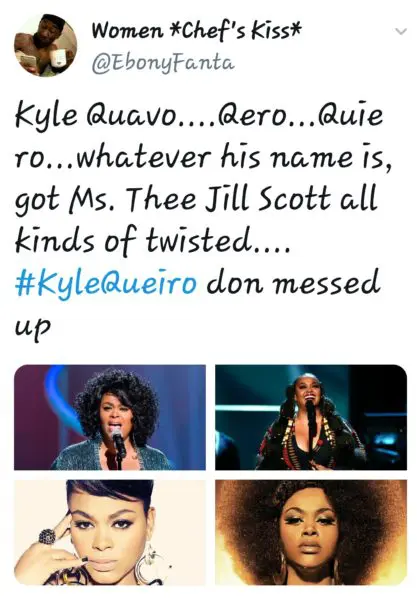 What do you think about Kyle Queiro’s now-deleted tweets questioning Jill Scott’s appeal? Sound off in the comments!