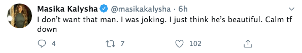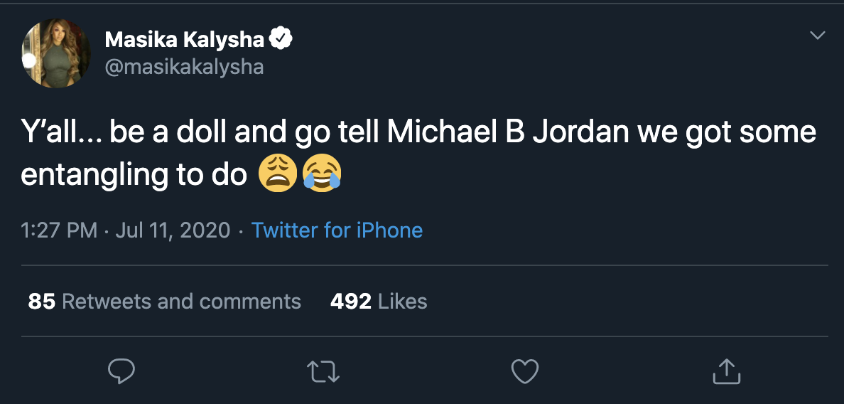 Update #1: Masika Kalysha says she was joking, in reference to her recent tweet about Michael B. Jordan. She writes: