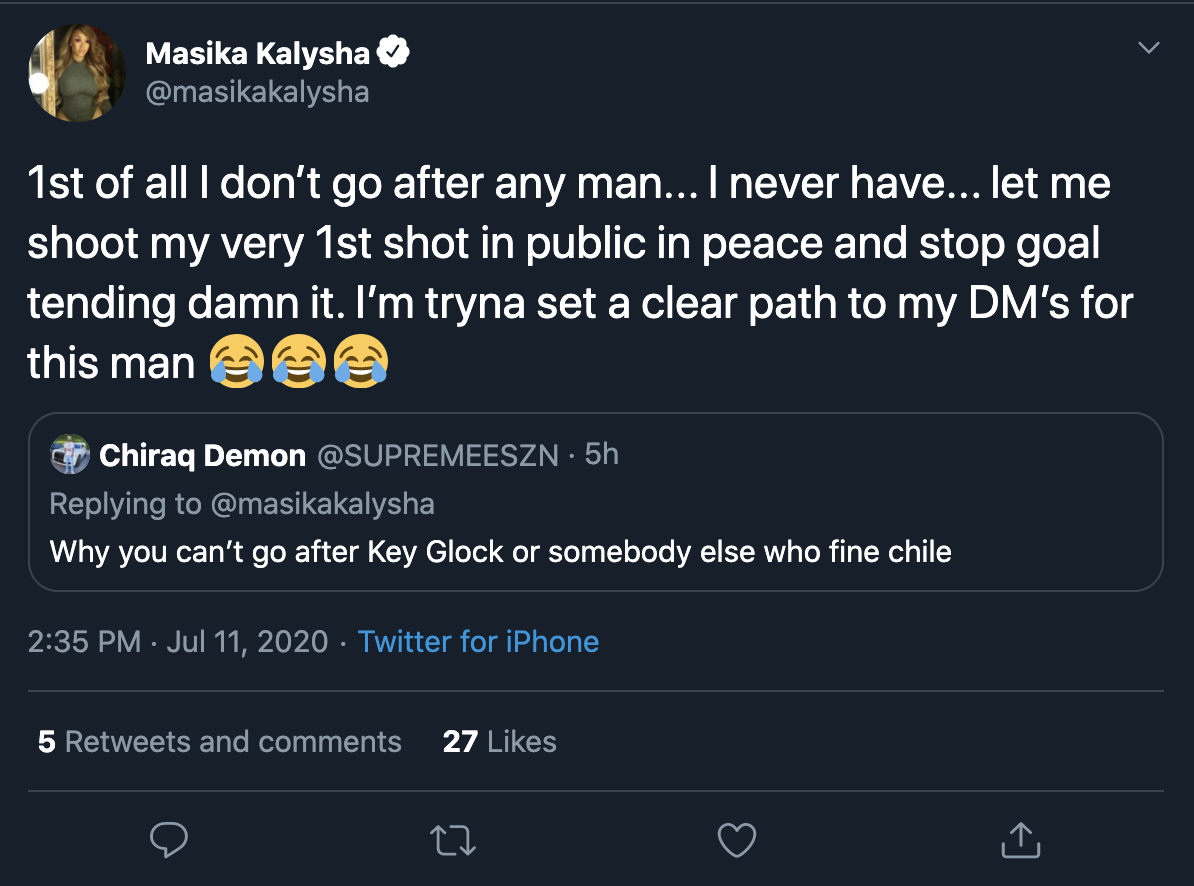 However, Masika Kalysha clapped back at a fan that suggested that she find someone else that is single and attractive, like rapper Key Glock. She wrote back,