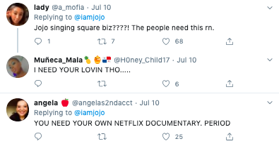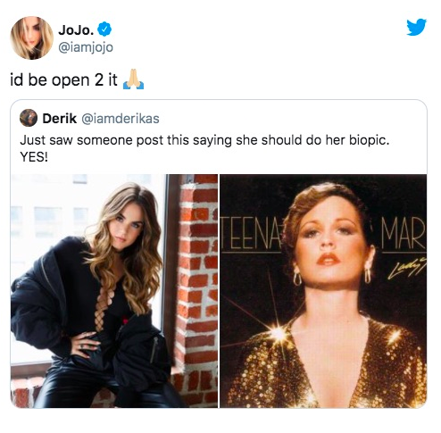 A fan had tweeted that JoJo, 29, should play the role of late songstress Tenna Marie in a biopic, should one be created.