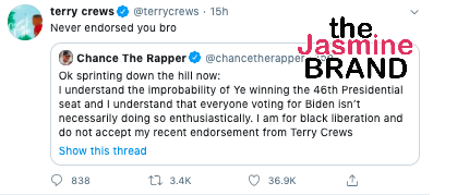 I understand the improbability of Ye winning the 46th Presidential seat and I understand that everyone voting for Biden isn’t necessarily doing so enthusiastically. I am for black liberation and do not accent my recent endorsement from Terry Crews”