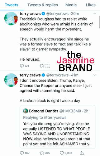 “I don’t endorse Biden, Trump, Knaye, Chance the Rapper or anyone else- I just agreed with something he said. A broken clock is right twice a day…Frederick Douglass had to resist white abolitonists who were afraid his clarity of speech would harm the movement. They actually encourage him since he was a former slave to “act and talk like a slave” to garner sympathy. He refused.”