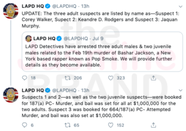 Update #2 (July 10th): More details are coming out about the five suspects in custody for Pop Smoke’s death. LAPD identified the three adult suspects on Twitter: Corey Walker, Keandre D. Rodgers, and Jaquan Murphy.