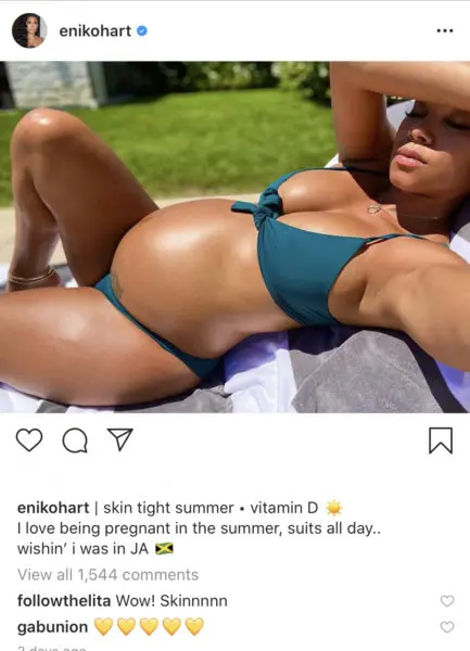 Eniko Hart’s pregnancy with baby number two is moving right along, and she’s showing off her growing baby bump. The wife of comedian and actor Kevin Hart shared a photo of her rocking a teal bikini with her bump on full display Monday (July 13th).