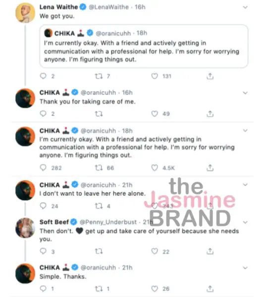 Chika updated her fans letting them know that she was doing okay and that she was with a friend helping her seek professional help.