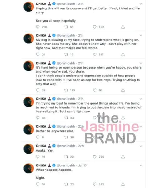 Rapper Jane Chika Oranika, known professionally as “Chika”, had her fans fearing for her life after she began posting a series of cryptic tweets on Twitter on Monday (July 13th.)