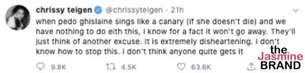 Teigen stated that even when the truth is revealed, which would show she has no involvement with Jeffrey Epstein, she believes that attacks will still continue to come. She referenced socialite Ghislaine Maxwell, who was a known associate of Epstein’s and recently charged with enticement of minors and sex trafficking of children. Teigen wrote,