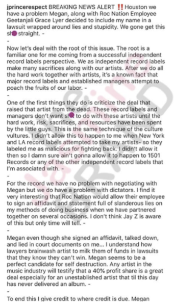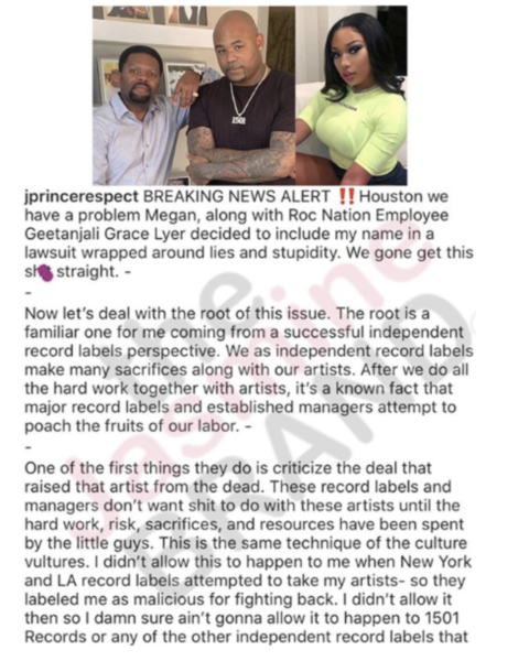 “BREAKING NEWS ALERT ??Houston we have a problem Megan, along with Roc Nation Employee Geetanjali Grace Lyer decided to include my name in a lawsuit wrapped around lies and stupidity. We gone get this s*** straight.”