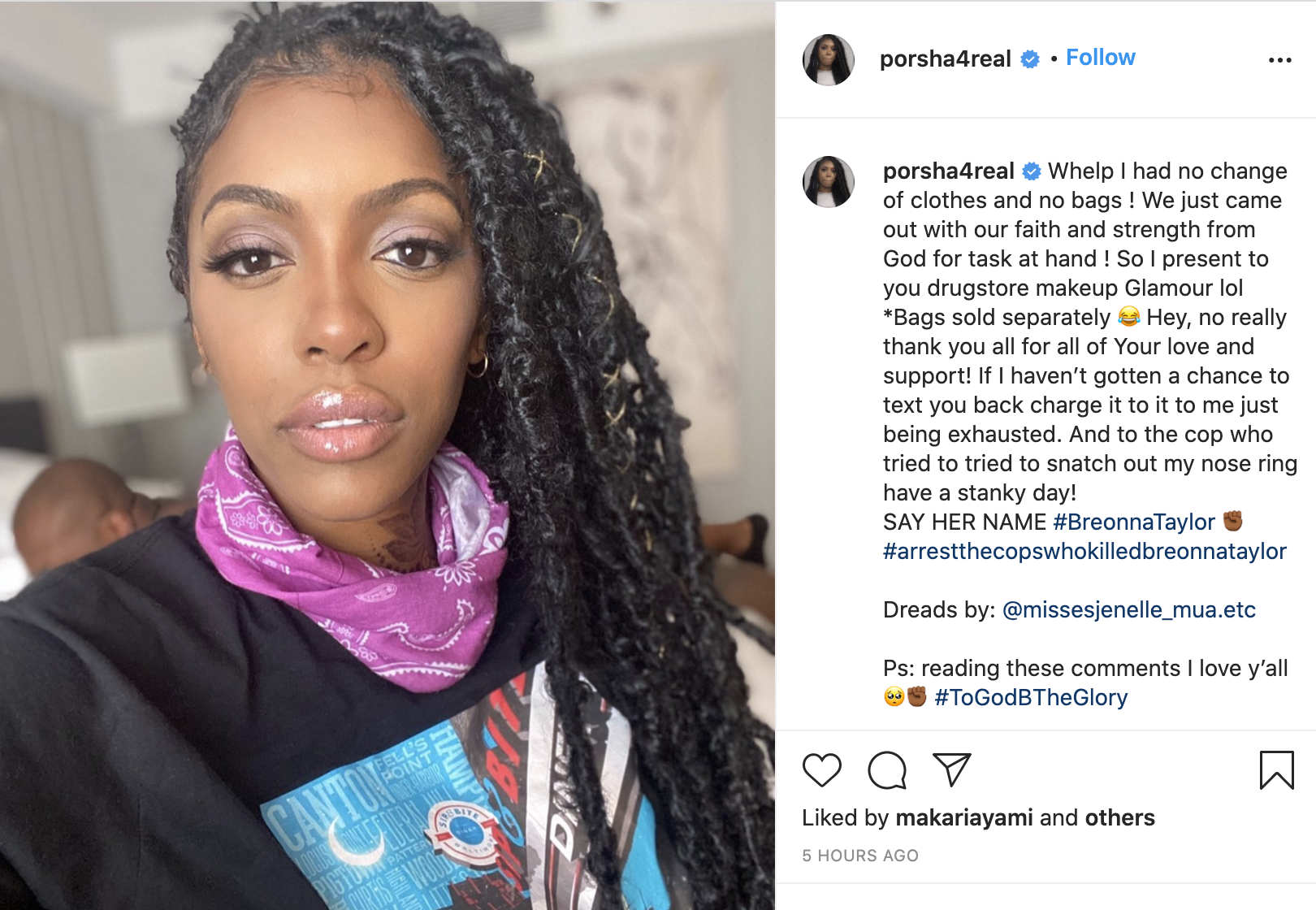“Whelp I had no change of clothes and no bags ! We just came out with our faith and strength from God for task at hand ! So I present to you drugstore makeup Glamour lol *Bags sold separately Hey, no really thank you all for all of Your love and support! If I haven’t gotten a chance to text you back charge it to it to me just being exhausted. And to the cop who tried to tried to snatch out my nose ring have a stanky day!