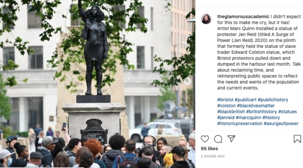 A powerful image of Black Lives Matter protester, Jen Reid, has been memorialized in the form of a statuesque sculpture that was mounted in Bristol, England. It has replaced a now-dismounted statue of historical slave trader, Edward Colston that had been standing since first erected in 1895.