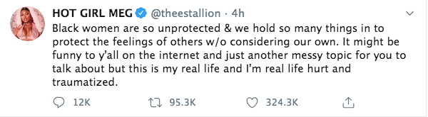 Black women are so unprotected & we hold so many things in to protect the feelings of others w/o considering our own. It might be funny to y’all on the internet and just another messy topic for you to talk about but this is my real life and I’m real life hurt and traumatized.