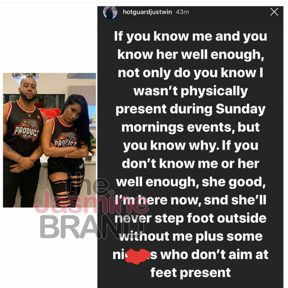 If you know me and you know her well enough, not only do you know I wasn’t physically present during Sunday mornings events, but you know why. If you don’t know me or her well enough, she good, I’m here now, and she’ll never step foot outside without me plus some n****s who don’t aim at feet present